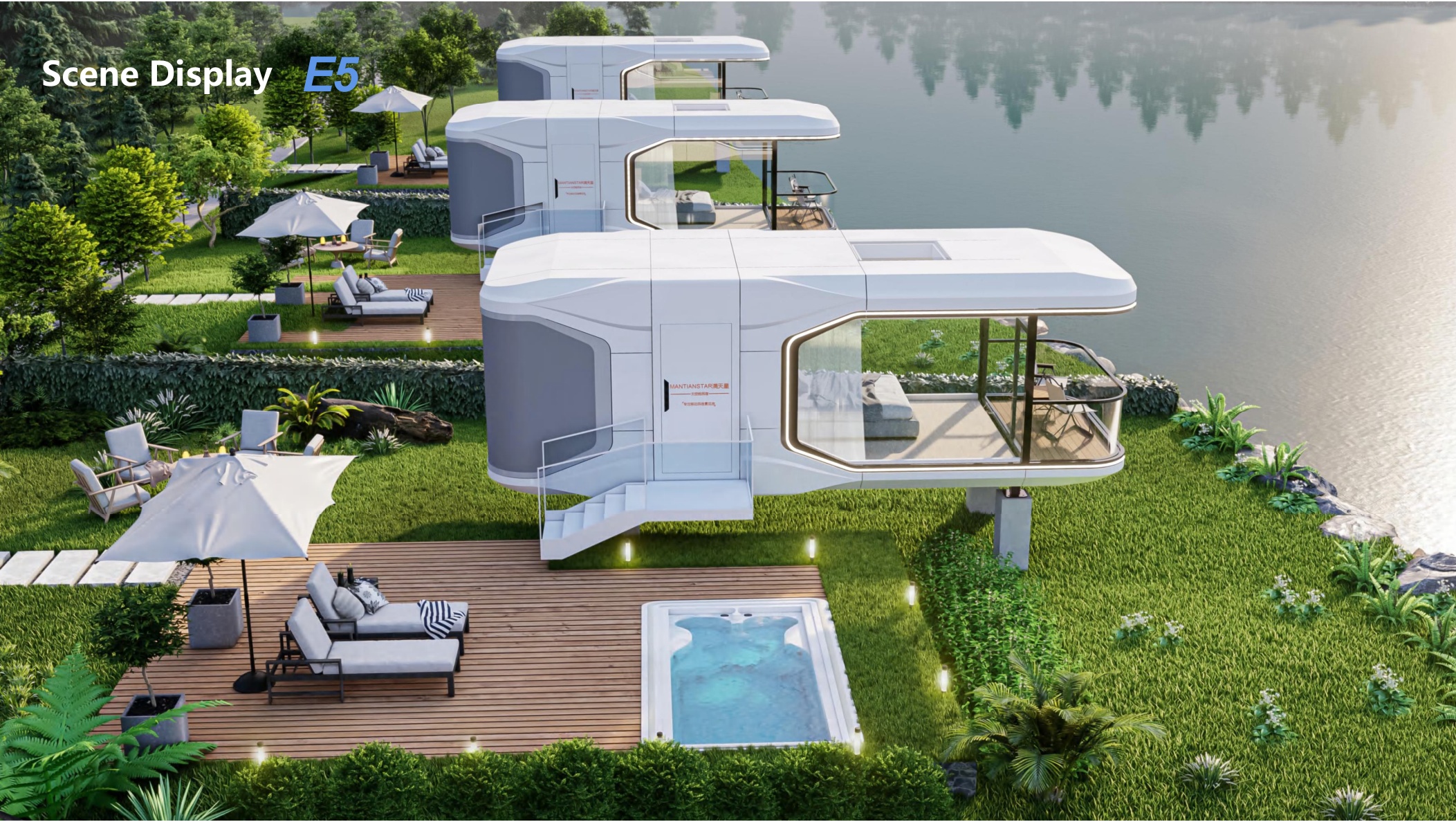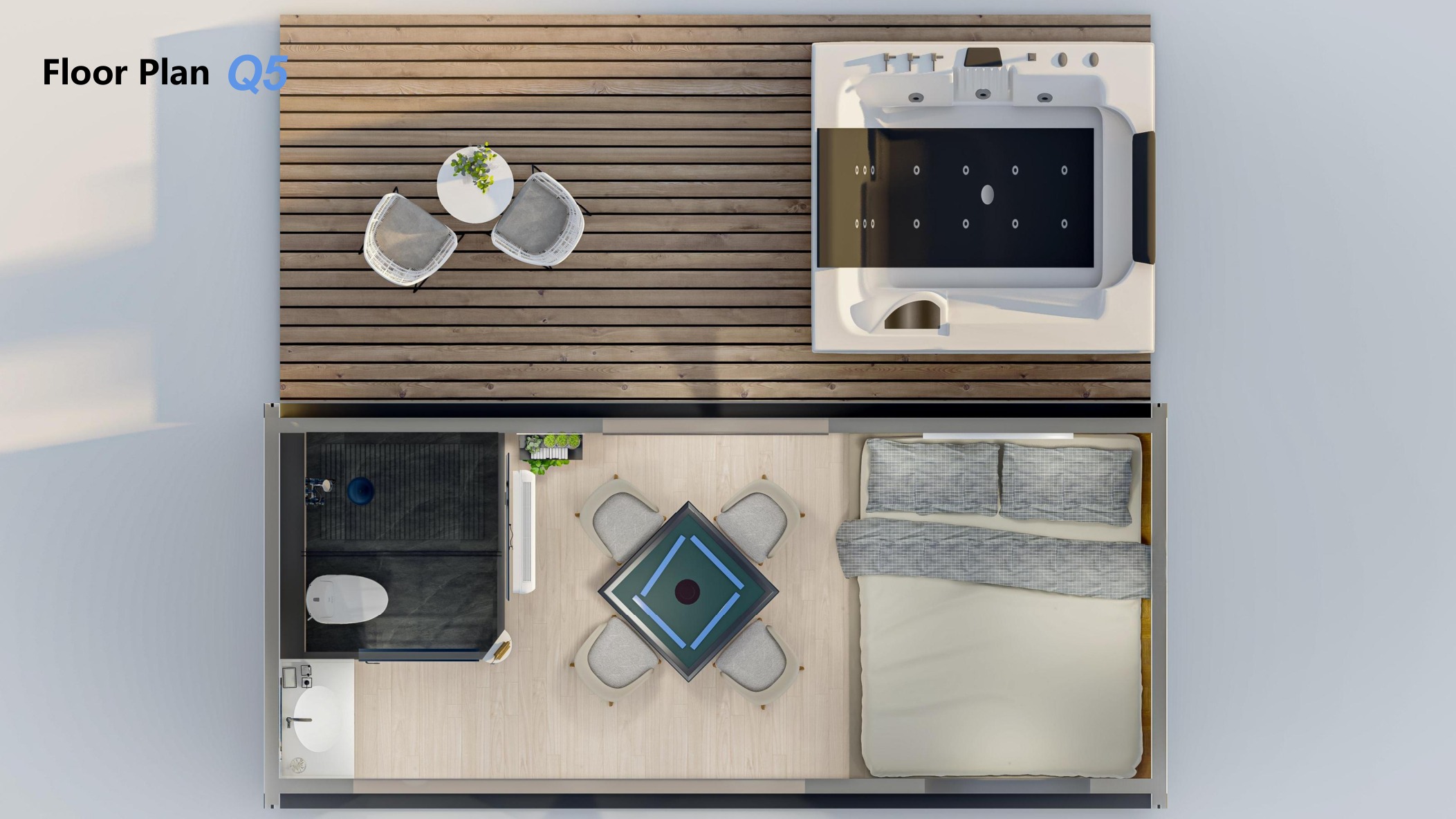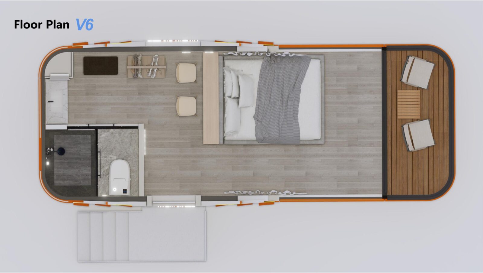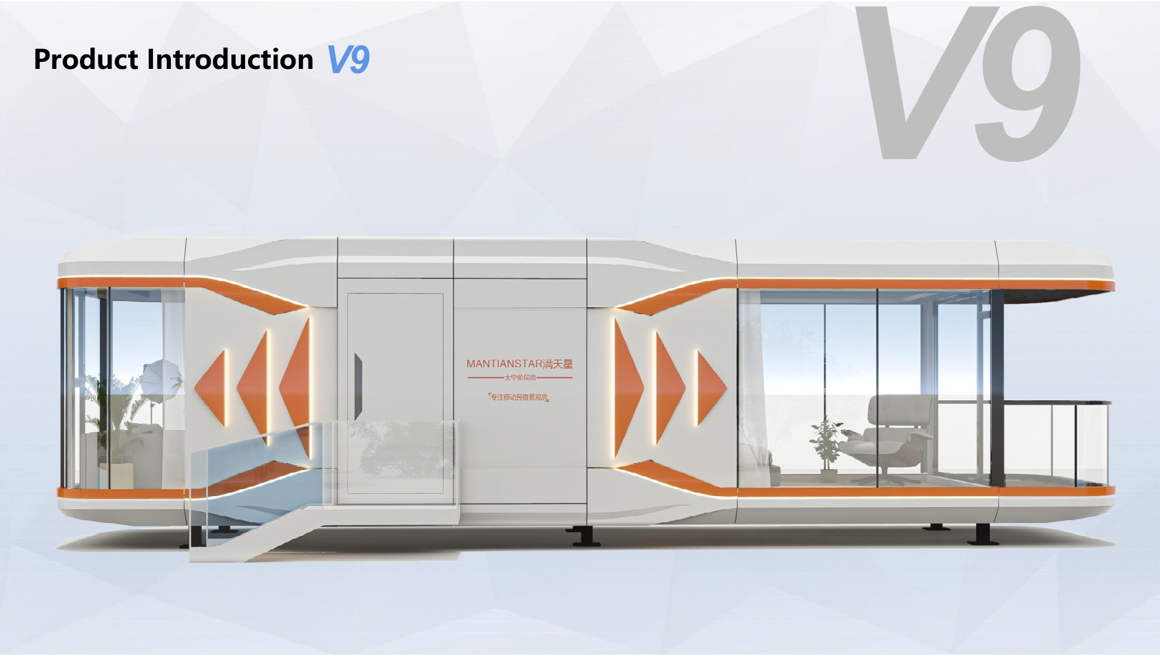 V9 je prostran model idealan kao smještajna jedinica za turizam (resorti/kampovi), s fleksibilnim tlocrtnim rješenjima (raspored se može prilagoditi). Konstrukcija je čelični okvir + aluminijska školjka, uz višeslojnu izolaciju i Low-E kaljeno staklo.