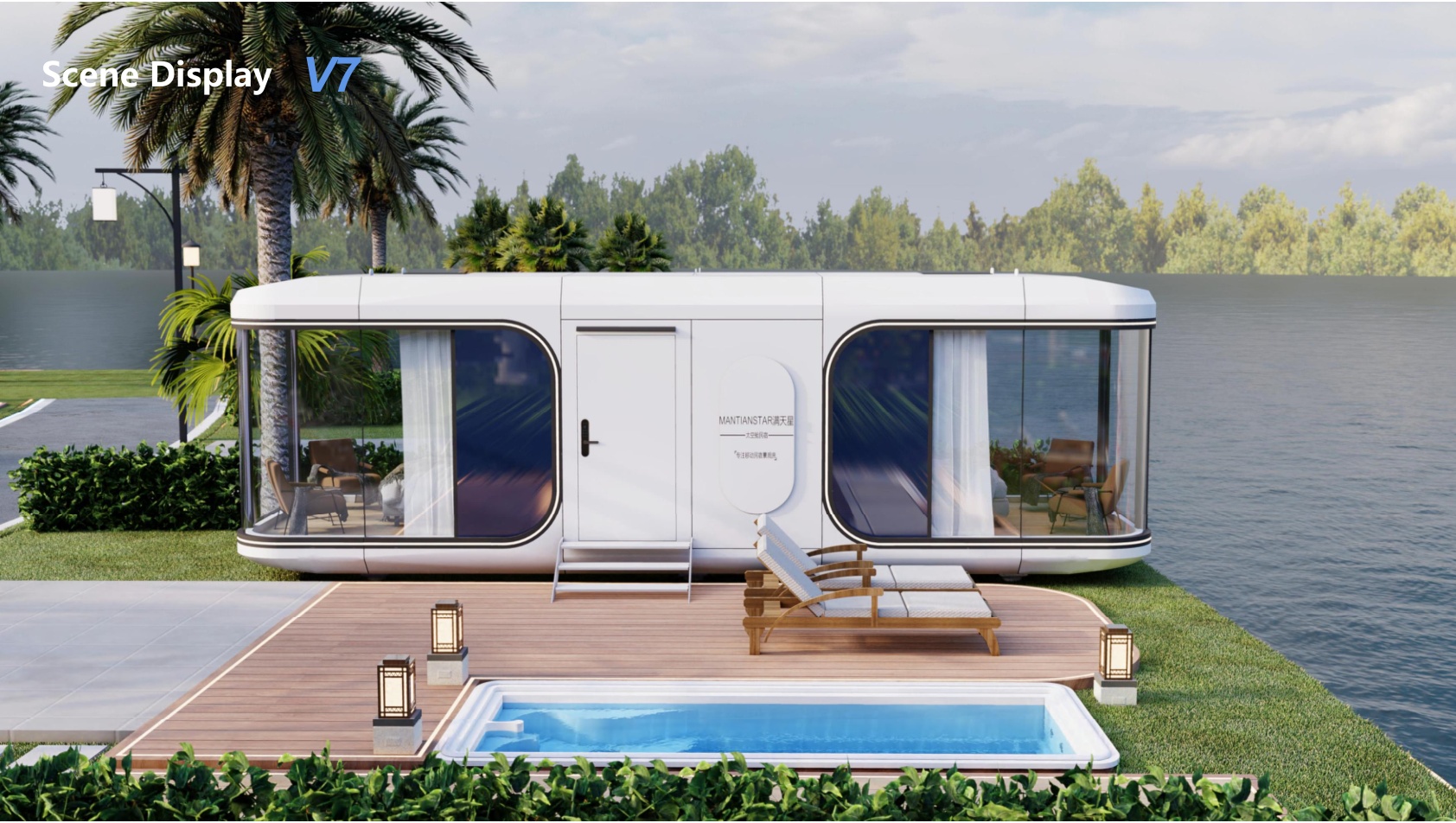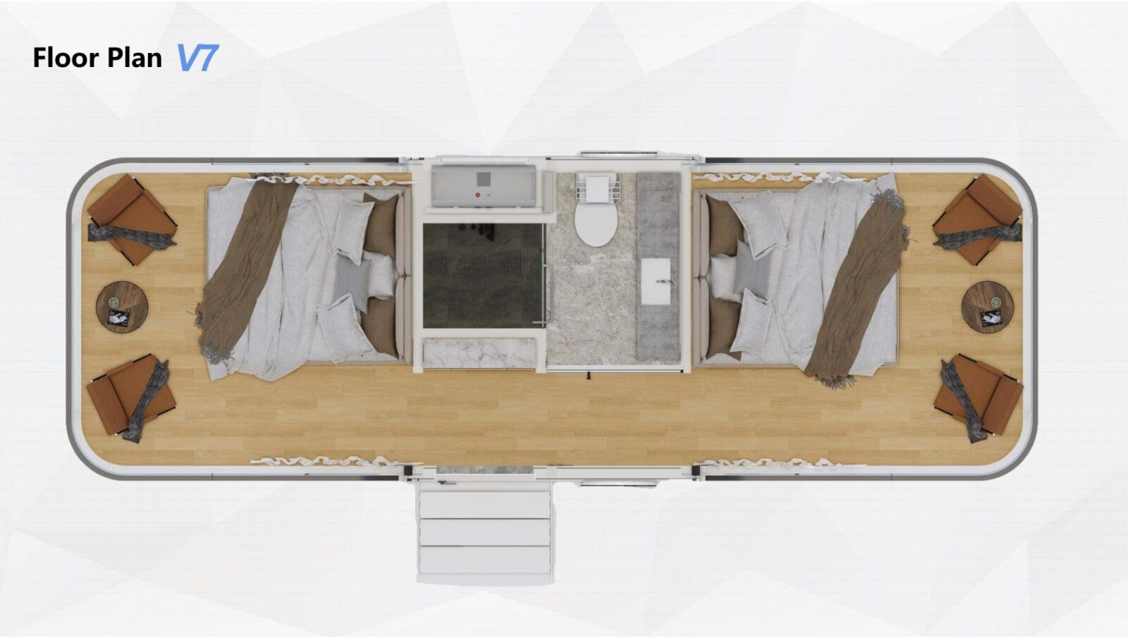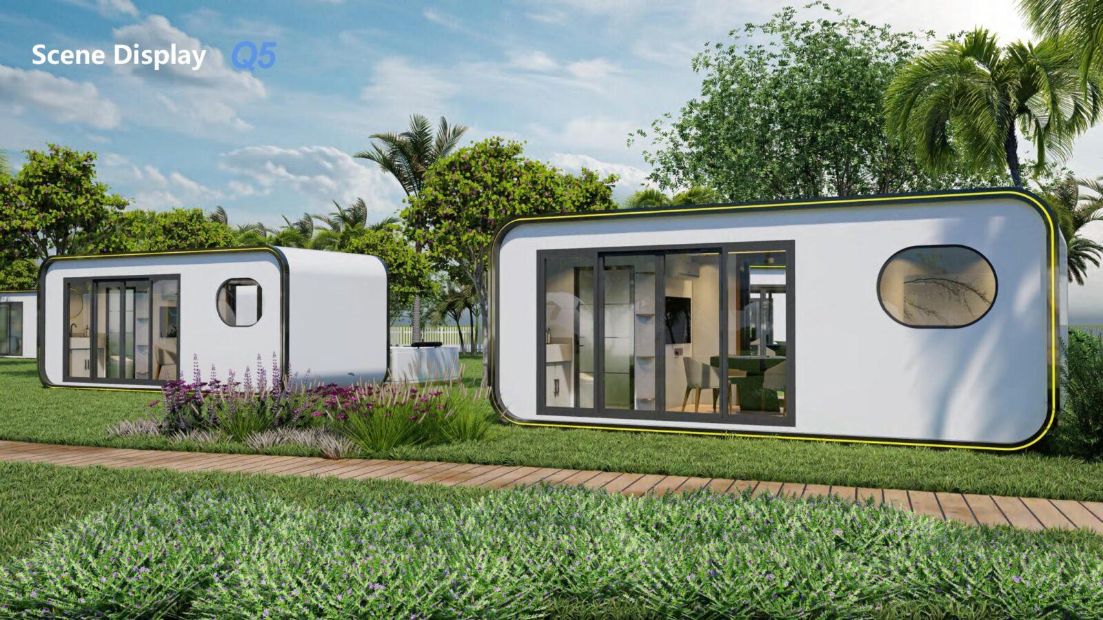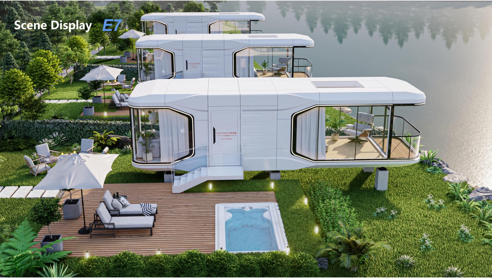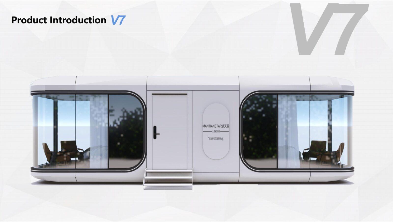 V9 je prostran model idealan kao smještajna jedinica za turizam (resorti/kampovi), s fleksibilnim tlocrtnim rješenjima (raspored se može prilagoditi). Konstrukcija je čelični okvir + aluminijska školjka, uz višeslojnu izolaciju i Low-E kaljeno staklo.