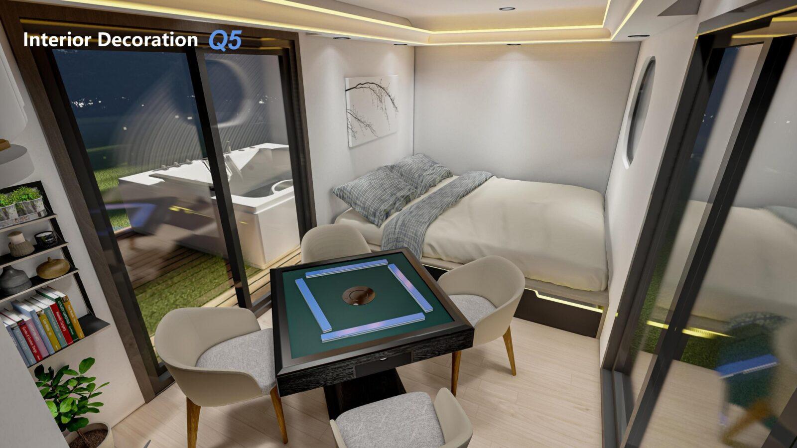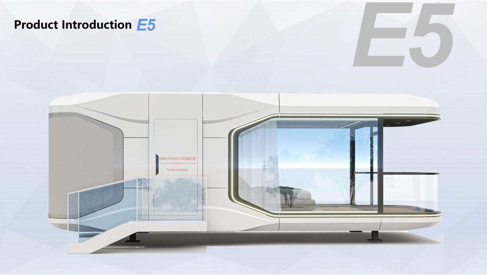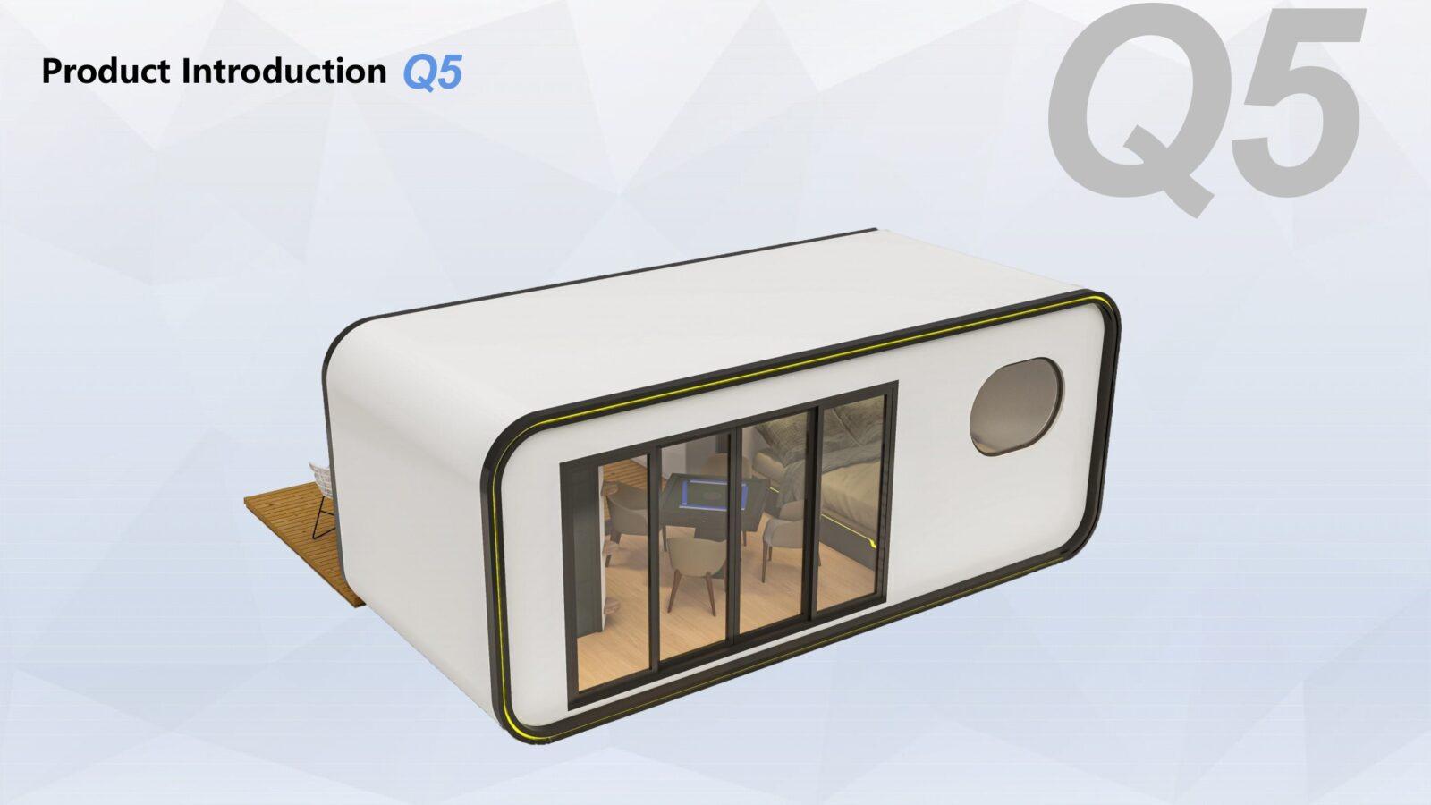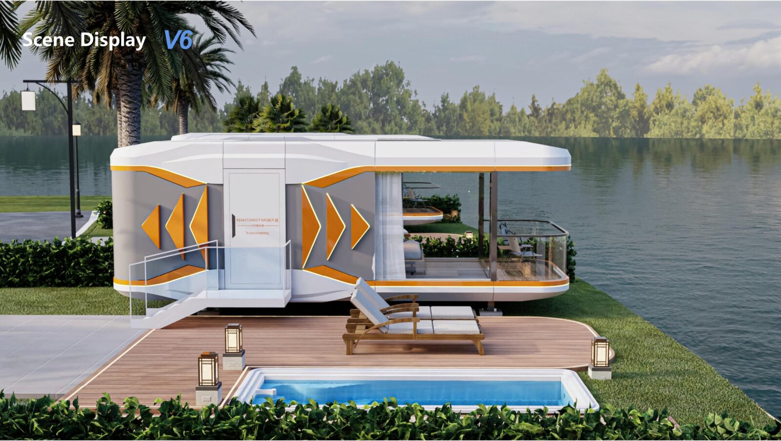 V9 je prostran model idealan kao smještajna jedinica za turizam (resorti/kampovi), s fleksibilnim tlocrtnim rješenjima (raspored se može prilagoditi). Konstrukcija je čelični okvir + aluminijska školjka, uz višeslojnu izolaciju i Low-E kaljeno staklo.