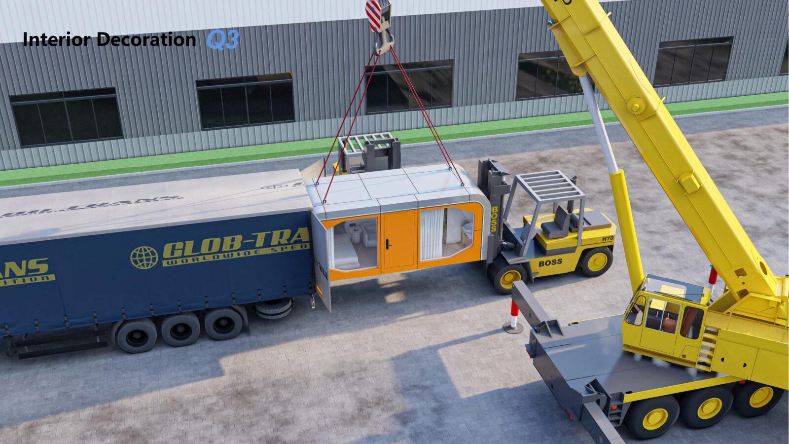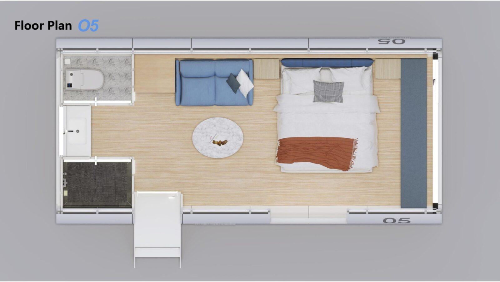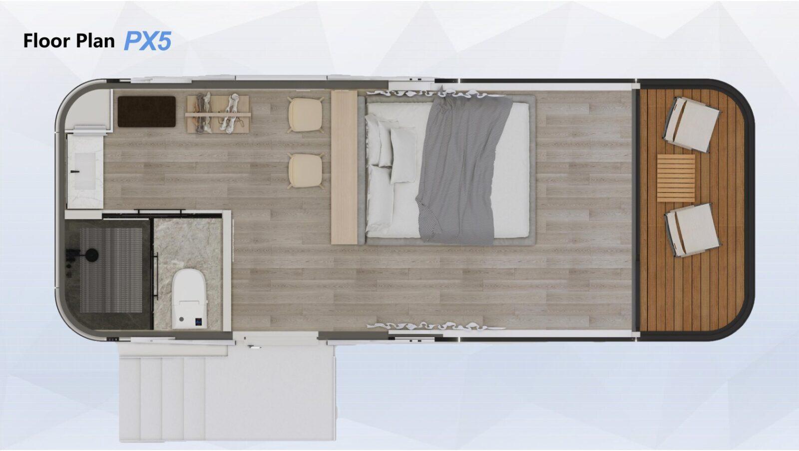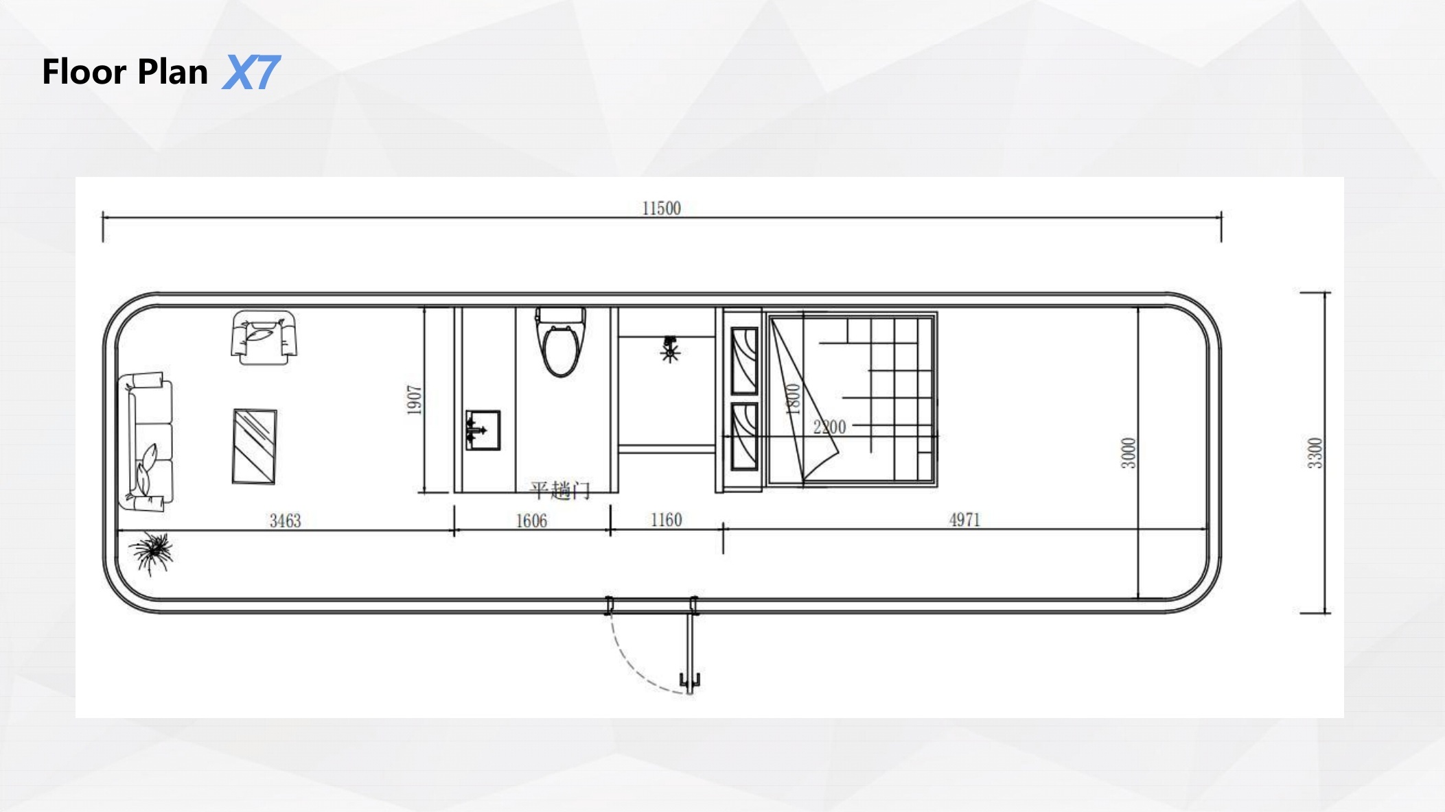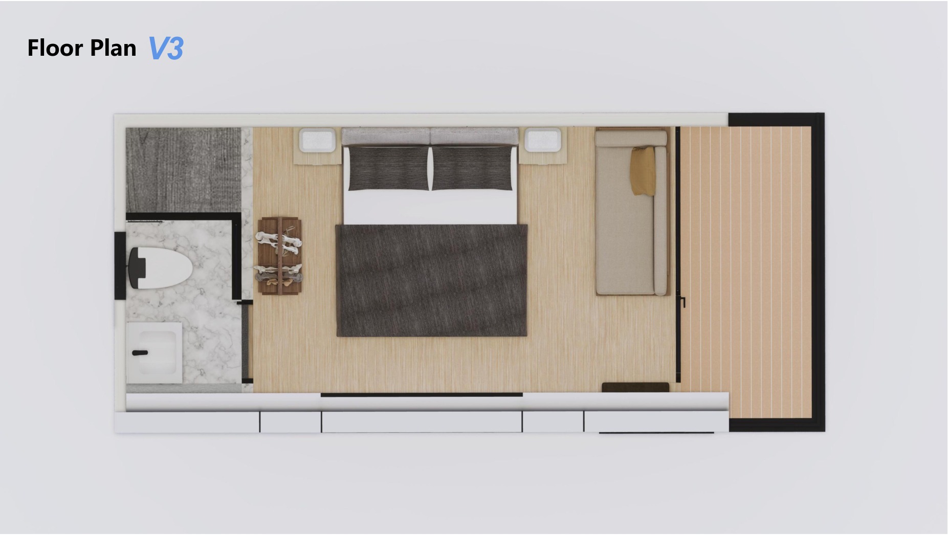 V9 je prostran model idealan kao smještajna jedinica za turizam (resorti/kampovi), s fleksibilnim tlocrtnim rješenjima (raspored se može prilagoditi). Konstrukcija je čelični okvir + aluminijska školjka, uz višeslojnu izolaciju i Low-E kaljeno staklo.